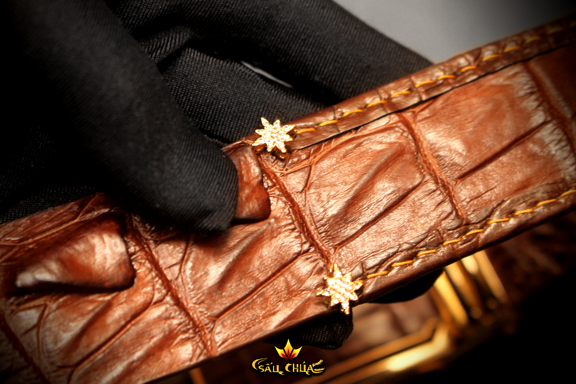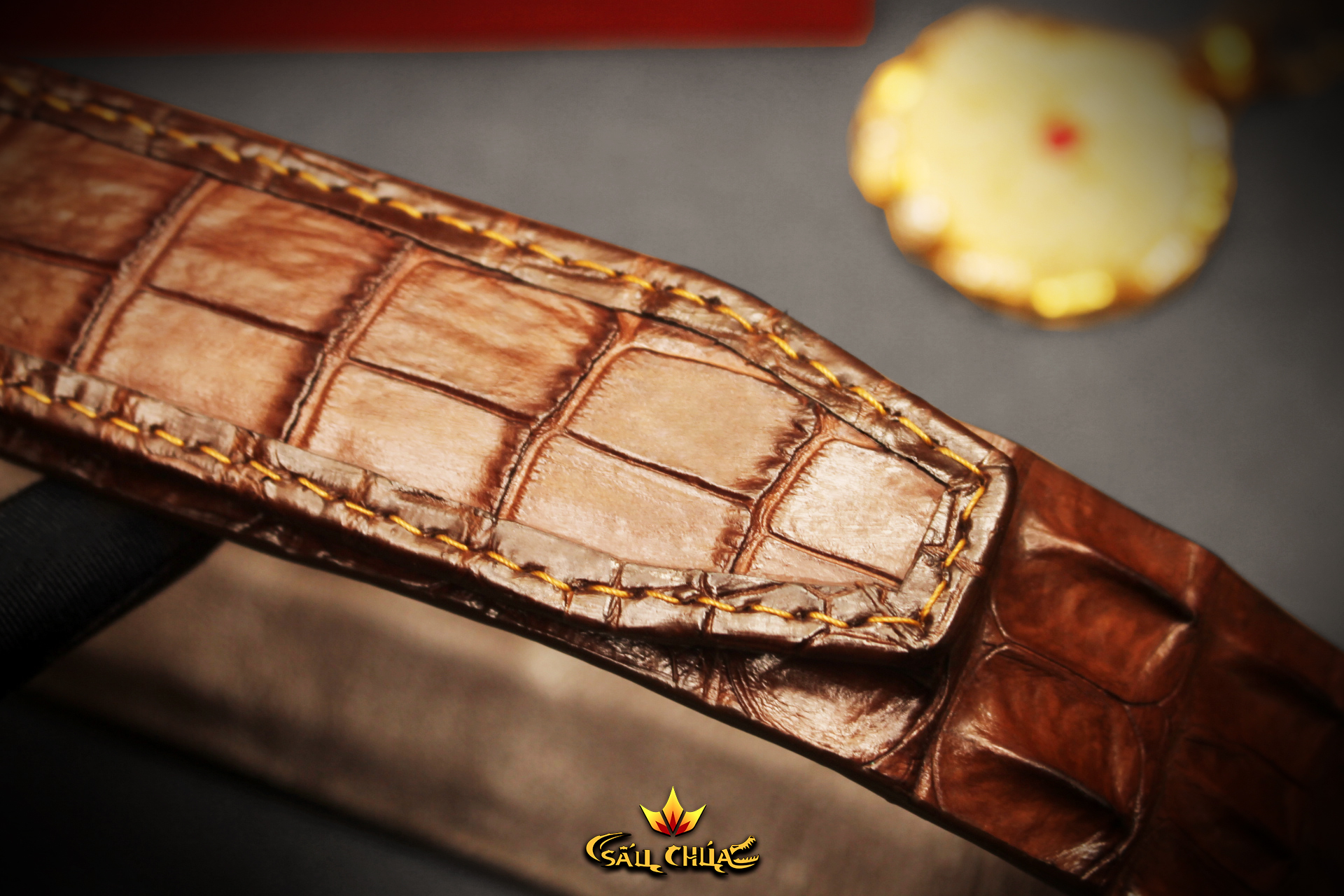 👉 Đuôi dây được bọc viền bằng da cá sấu sang trọng, từng đường đục chỉ may đều được làm thủ công chắc chắn có nét thẩm mỹ cao.
